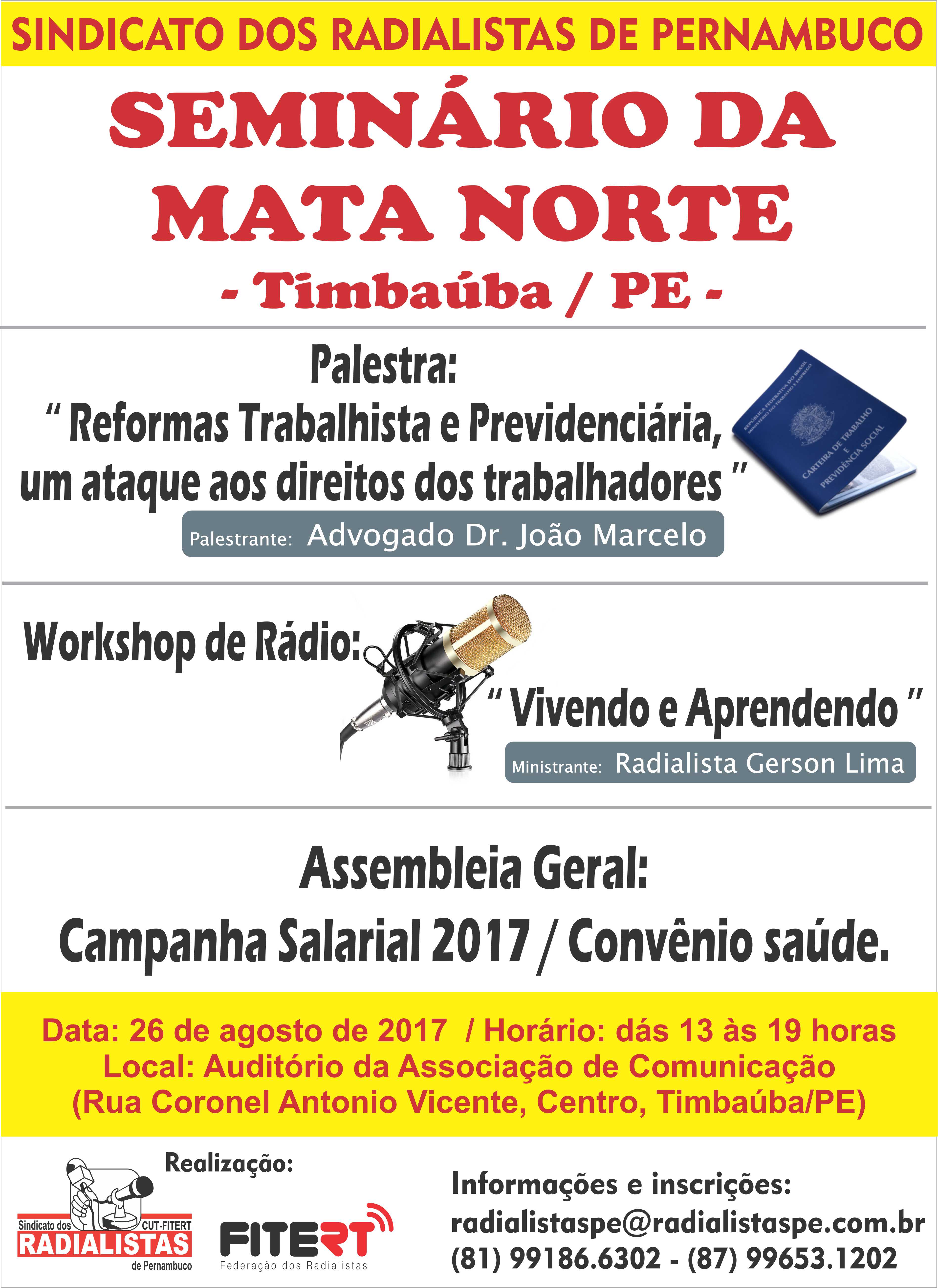 Dando continuidade ao ciclo de realização de seminários de capacitação para os Radialistas, o Sindicato dos Radialistas de Pernambuco vai promover na cidade de Timbaúba, no próximo sábado, dia 26 de agosto, o Seminário da Mata Norte com foco na discussão das questões ligadas à categoria, como valorização profissional, mercado de trabalho e regulamentação profissional. O Seminário acontece no auditório da Associação de Comunicação de Timbaúba, situado na rua Coronel Antonio Vicente, centro, com horário previsto dás 13 as 19 horas.
